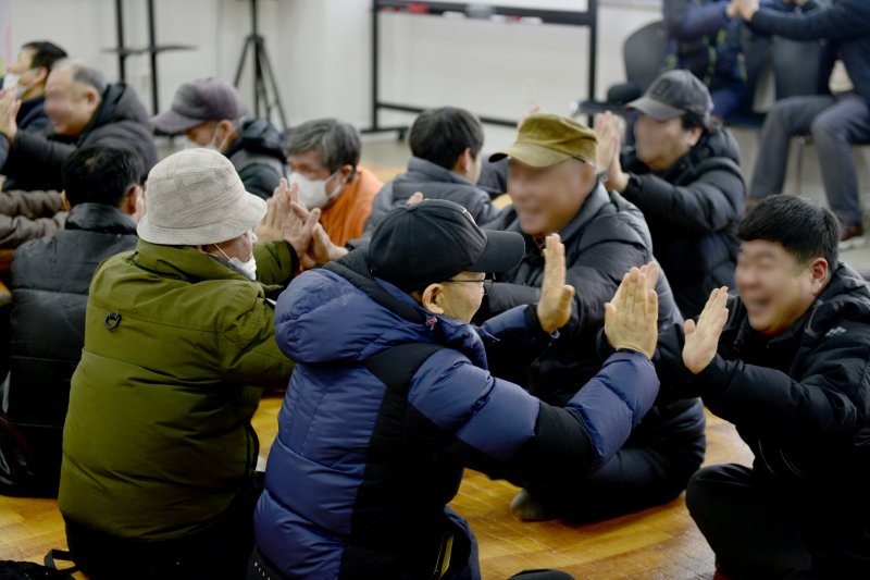 쪽방촌 주민 50여명은 2명씩 팀을 지어 서로를 마주보며 손을 잡고 "미남이시네요", "인상이 좋으십니다"는 등 칭찬하면서 손바닥을 마주치며 박장대소했다.