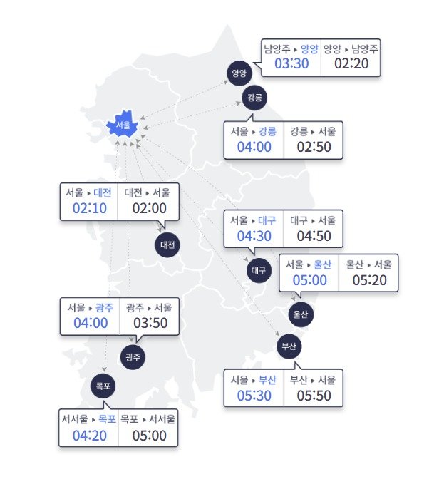 같은 시각 지방에서 서울까지 시간은 △부산 5시간 50분 △울산 5시간 20분 △강릉 2시간 50분 △양양 2시간 20분(남양주 도착) △대전 2시간 △광주 3시간 50분 △목포 5시간(서서울 도착) △대구 4시간 50분이다.
