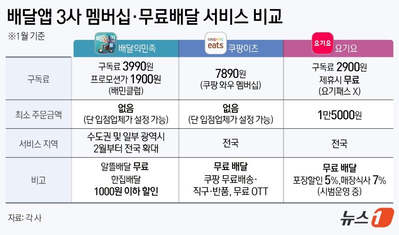 배민은 자체 배달인 다건 배달(알뜰배달)에 한해 무료 배달을 제공하고 쿠팡이츠와 요기요는 단건배달(한집배달)까지 배달비를 받지 않는다. 또 쿠팡이츠는 쿠팡 와우 멤버십 회원에 무료 배달 혜택을 제공하기 때문에 음식배달 서비스 외에도 OTT, 쿠팡 무료배송·직구 등 추가 혜택을 함께 누릴 수 있다.