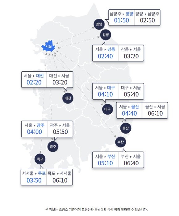 같은 시각 지방에서 서울까지 시간은 △부산 6시간 40분 △울산 6시간 10분 △강릉 3시간 20분 △양양 2시간 50분(남양주 도착) △대전 3시간 20분 △광주 6시간 40분 △목포 6시간 10분(서서울 도착) △대구 5시간 40분이다.