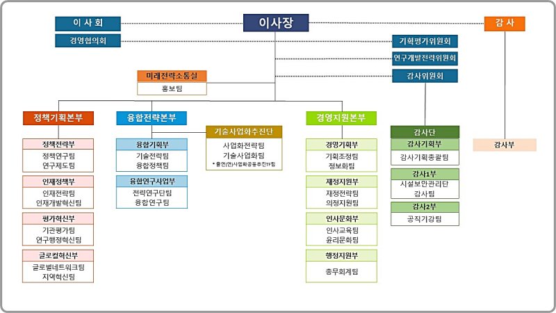 기존 정책본부, 융합본부, 경영본부의 명칭은 각 '정책기획본부', '융합전략본부', '경영지원본부'로 변경하고 하부조직을 재정비해 기관운영방향의 구체성과 업무 연계성을 명확히했다.