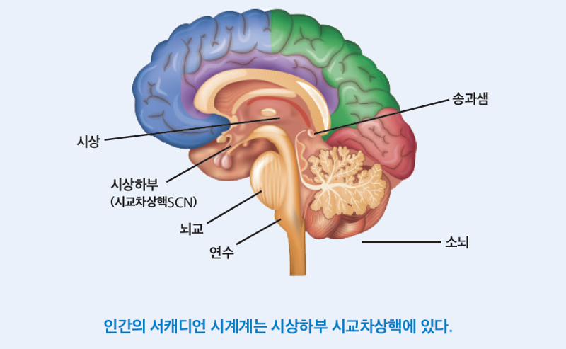 시상하부 앞쪽에는 수많은 신경세포와 신경섬유가 뭉쳐진 핵이 있는데 이것을 시교차상핵이라고 부른다. 바로 이 핵이 서캐디언 리듬을 만드는 마스터 시계의 역할을 한다. 심박수, 혈압, 체온, 방광수축 등의 모든 자율신경과 호르몬 분비를 24시간 주기에 맞춰 이곳에서 조절한다.