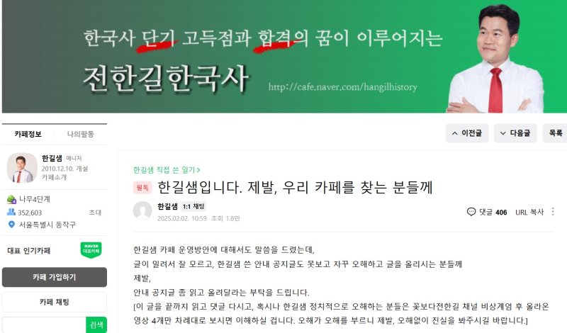 전씨가 운영 중인 '전한길 한국사' 카페의 '한길샘 직접 쓴 일기' 게시판에는 올 초부터 3일까지 '한길샘'이란 본인의 닉네임으로 작성한 9개의 글 중 8개가 정치적 상황을 다룬 글이었다.