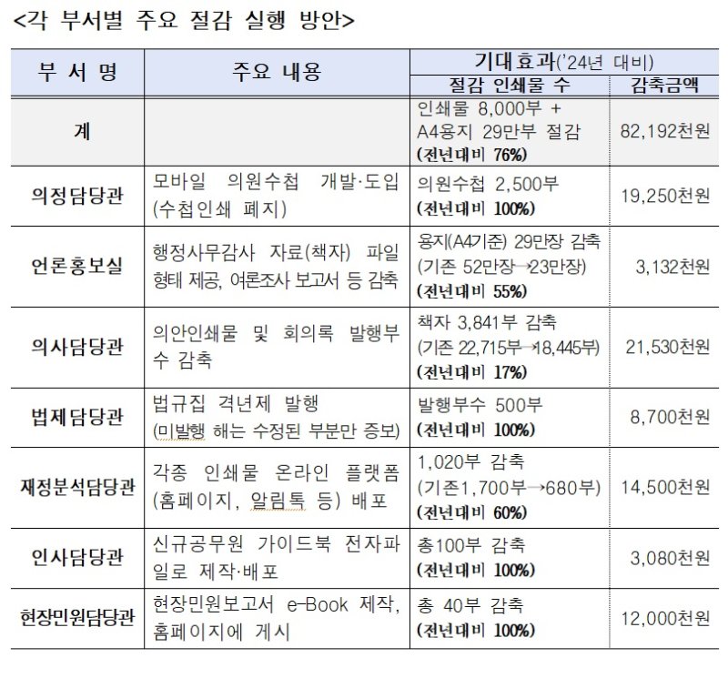 또 인쇄물 디지털화 작업(이미지·PDF 파일 등)을 통해 부서별 인쇄물 발행·배포 방식을 개편한다. 시의회 누리집과 누리소통망(SNS)을 비롯해 전자우편, 의정플러스, 알림톡 등 온라인 플랫폼을 활용한다.