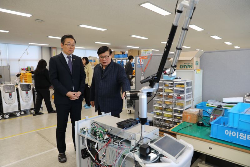 [파이낸셜뉴스] 김완기 특허청장(왼쪽)이 4일 오후 대전 유성구의 '특허로 R&D(특허 기반 연구개발 전략지원)'우수기업인 원텍에서 회사 관계자로 부터 제품 생산과정에 대한 설명을 듣고 있다.