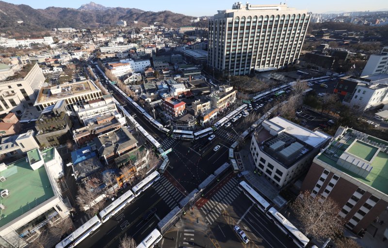 도로 한가운데는 거대한 차벽이 세워졌다. 헌재 앞 북촌로와 집회가 열리는 삼일대로 사이는 경찰버스 4개가 가로막고 있다. 헌재 정문 앞 북촌로 4개 차로 중 2개 차로에도 경찰버스 약 40대가 세워졌다.