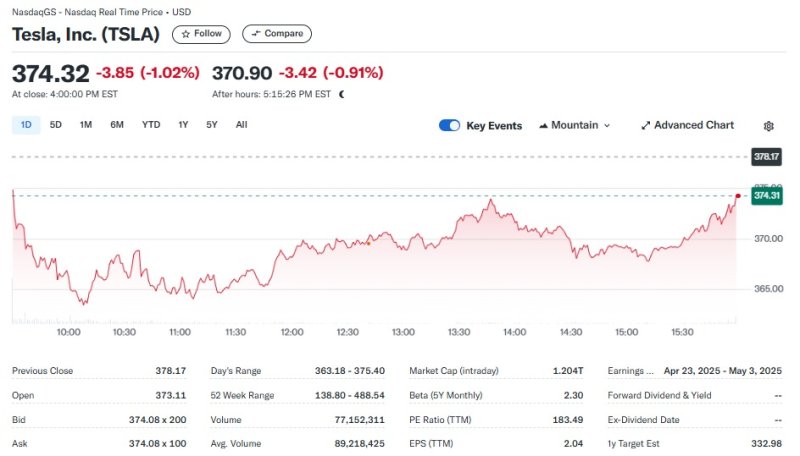 6일(현지시간) 뉴욕증시에서 테슬라는 1.02% 하락한 374.32달러를 기록했다.