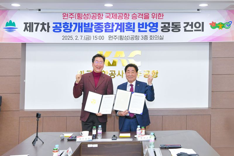 이날 공동 건의문 서명식에는 원강수 원주시장과 김명기 횡성군수가 참석해 원주(횡성)공항의 국제공항 승격에 뜻을 모았다.