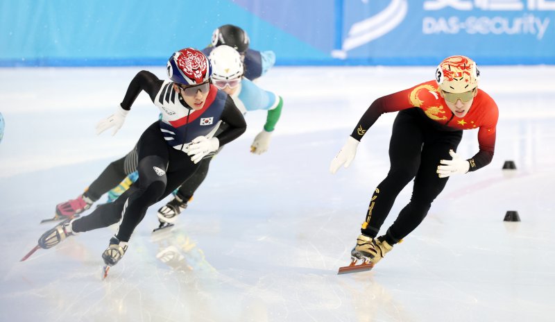 8일(현지시간) 중국 헤이룽장성 하얼빈 빙상훈련센터 다목적홀에서 열린 하얼빈 동계아시안게임 쇼트트랙 남자 500m 준결승에서 박지원이 역주하고 있다. 2025.2.8/뉴스1 ⓒ News1 이승배 기자