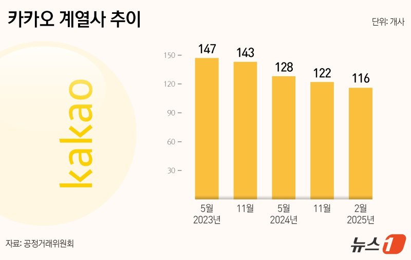 10일 공정거래위원회에 따르면 카카오 계열사는 올해 2월 기준 116개 사다. 2023년 5월(147개 사)과 비교해 31개 사가 줄었다. 불과 1년 9개월 만에 전체 21.1% 수준의 계열사를 정리했다.