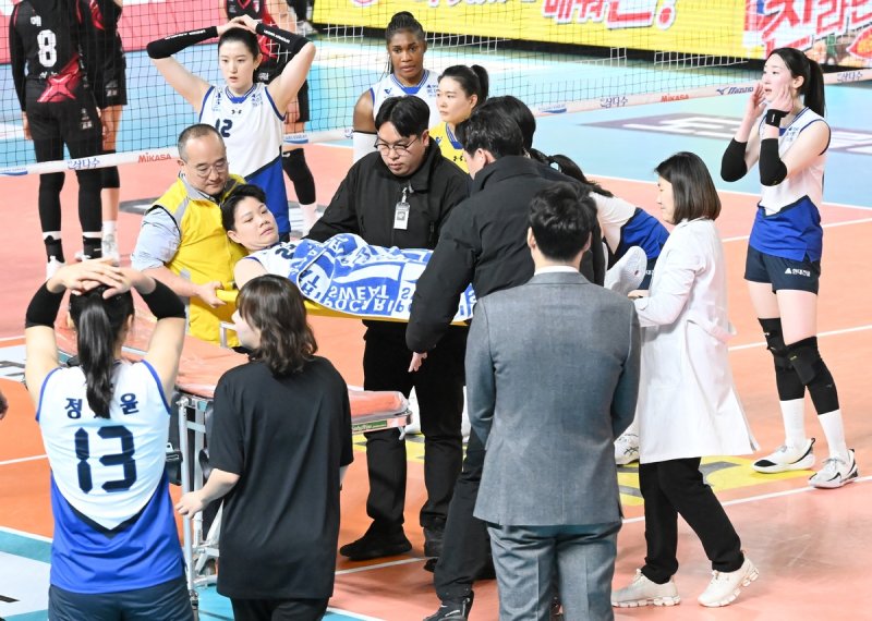 위파위는 지난 7일 정관장과의 경기 3세트 중반 공격 후 착지하다가 무릎 통증을 느껴 들것에 실려 나갔다.