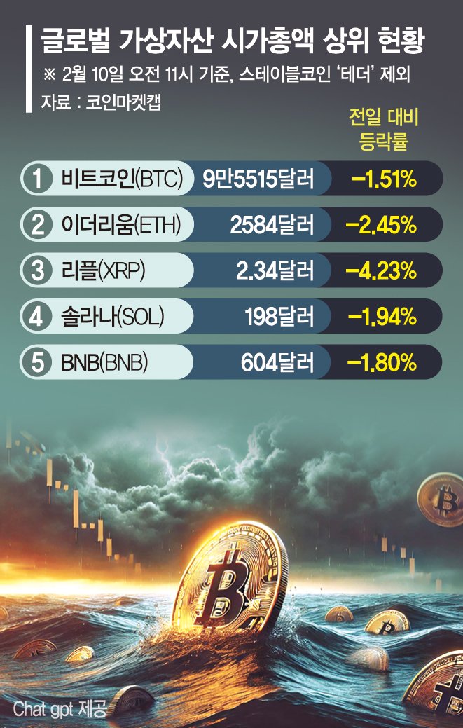 글로벌 가상자산 정보 플랫폼 코인마켓캡에 따르면 10일 오전 11시 기준 비트코인의 가격은 9만5515달러로, 전일대비 1.51% 하락했다. 비트코인을 제외한 알트코인의 하락률은 더 크다. 시가총액 기준 5위(스테이블코인 제외) 내에서 하락률이 가장 컸던 리플의 가격은 하루 새 4.23% 내린 2.34달러, 이더리움은 2.45% 하락한 2584달러이다.