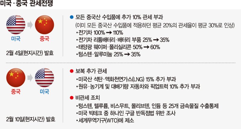 트럼프 대통령은 대선 기간 공언했던 60% 추가 관세에 못 미치는 10% 관세를 부과했고, 중국은 미국산 석탄·액화천연가스(LNG)에 15% 관세, 원유·농기계·대형 자동차에 10% 관세를 추가하는 등 '품목별 표적 관세'를 꺼내들면서 상대방의 대응과 추가 조치를 지켜보고 있다.