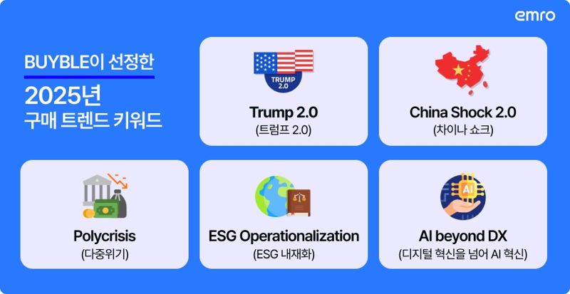 엠로 관계자는 "2025 구매 트렌드 리포트는 구매 분야의 권위자인 국민대학교 최정욱 교수의 자문을 받아 제작됐다"며 "이번 리포트를 통해 구매 담당자들이 글로벌 정치·경제 환경에 대한 인사이트를 얻고 이에 맞는 전략과 업무 방향을 설정해 새로운 기회를 모색하는 데 도움이 되길 바란다"고 말했다.