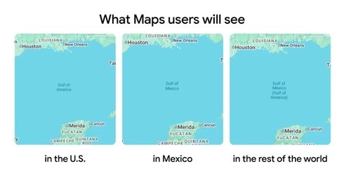 구글이 트럼프 행정부의 지명 변경 방침에 따르면서 미국 내 구글 맵스 사용자들의 화면에는 멕시코만 대신에 변경된 미국만이라는 지명이 뜬다. 북미 최고봉인 데날리산도 매킨리산으로 구글 지도에서 이름이 바뀌었다.