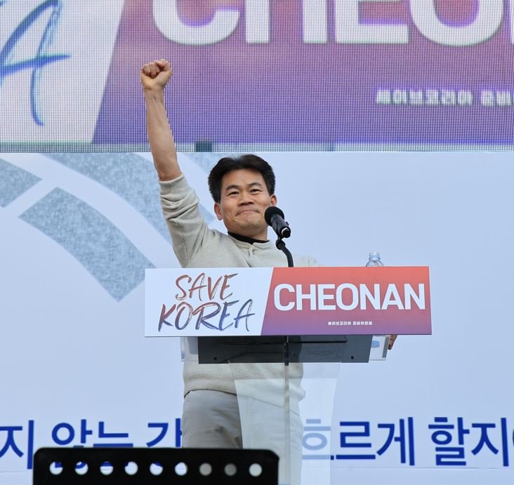 [천안·아산=뉴시스]박우경 기자 = 보수단체 확성기 역할을 자처한 한국사 일타강사 전한길 씨가 11일 "대한민국을 살릴 사람은 윤 대통령 뿐"이라고 강조했다.