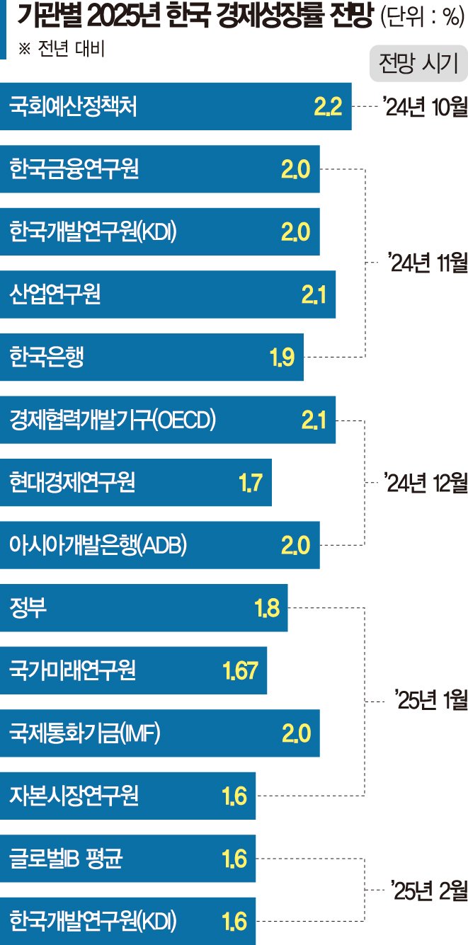 기획재정부는 12·3 계엄사태 이후 민간소비 둔화를 감안해 1.8%를 제시했다. 한국은행은 1.9%에서 1.6~1.7%로 하향 조정했다. 국제통화기금(IMF)은 지난달 발표한 세계경제전망에서 지난해 10월 전망치보다 0.2%p 낮은 2.0%를 전망했다. 국제신용평가사인 피치도 최근 한국의 올해 경제성장률 전망치를 당초 전망치 2.0%에서 1.7%로 0.3%p 낮췄다. 글로벌 투자은행(IB)들도 1.2~1.9%, 평균 1.6% 수준의 성장률을 전망하고 있다.