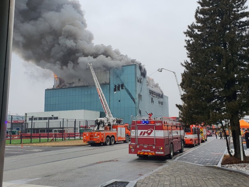 (익산=뉴스1) 신준수 기자 = 12일 오후 2시께 전북 익산시 용제동 LG화학생명과학 공장 약품 생산동 3층에서 불이 났다.