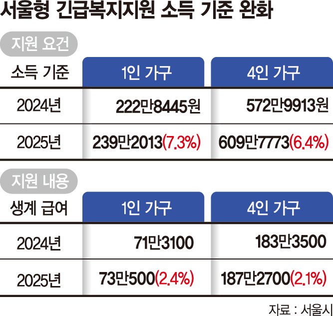 2025년도 기준중위소득이 인상됨에 따라 서울형 긴급복지지원 소득 기준도 완화한다. 1인 가구 기준 7.3%(2024년 222만8445원→2025년 239만2013원), 4인 가구 6.4%(2024년 572만9913원→2025년 609만7773원) 오른다.