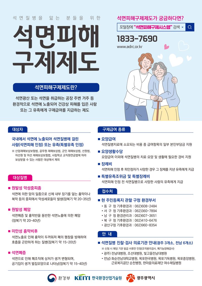 신규 '석면 피해 구제 급여' 신청은 석면질병검사기관인 전남대병원·조선대병원 등에서 검사받은 결과서와 함께 석면 피해 인정 신청서를 작성한 뒤 해당 주소지 구청 환경부서에 제출하면 된다. 이후 환경부 석면피해판정위원회에서 심의·의결을 거쳐 석면 피해 인정 여부 및 피해 등급을 결정하고, 인정 여부가 통지되면 보상을 받을 수 있다.