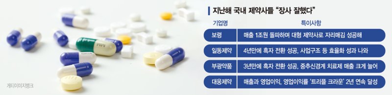 13일 제약업계에 따르면 지난해 보령은 사상 첫 '매출 1조 클럽'에 가입했고, 일동제약과 부광약품은 체질 개선과 경쟁력 강화로 오랜 적자에서 탈출하며 흑자 전환에 성공했다. 대웅제약은 매출과 영업이익, 영업이익률에서 2년 연속 사상 최대 성과를 올렸다.