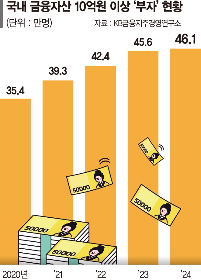 한편 KB금융지주 경영연구소가 발간한 '2024 한국 부자 보고서'에 따르면 지난해 말 기준으로 금융자산이 10억원 이상인 '부자'는 46만1000명이다. 전체 인구의 0.9%로 추산된다. 또 지난해 말 기준 한국 부자가 보유한 총금융자산은 2826조원에 달한다.