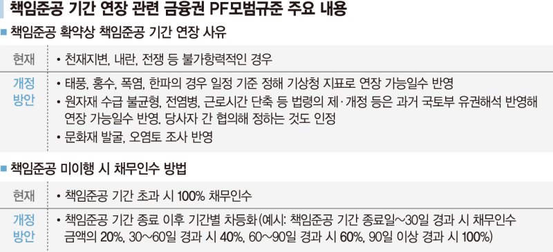 금융위가 공개한 금융권 PF 모범규준에는 구체적인 책임준공 기간 연장사유와 책임준공 미이행 시 시공사의 채무인수금액 비율의 기간별 차등화 방안이 제시됐다.