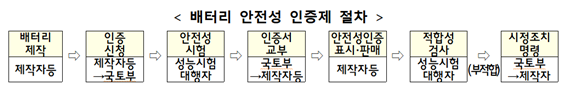 국토교통부는 이달부터 개정·시행되는 '자동차관리법'에 따라 이 같은 내용의 배터리 안전성 인증제와 이력관리제를 시행한다고 16일 밝혔다. 배터리 안전성 인증제는 기존에 제작사가 스스로 안전성을 인증하던 자기인증 방식에서 벗어나, 전기차 배터리에 대해서는 전기차에 탑재·판매하기 전에 정부가 직접 시험을 거쳐 안전성을 인증하는 제도다. 지난 2003년 자기인증제도를 시행한 이후 20여 년 만의 전면적인 제도 변화다. 정부가 배터리와 같은 신기술에 대한 안전성을 사전에 확보하고, 신기술 도입에 따른 위험부담도 정부가 업계와 분담한다는 점에서 의의가 있다.
