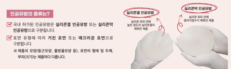 식약처가 발간한 의료기기 안전정보지를 보면 국내에 허가된 인공유방은 실리콘겔 인공유방 또는 실리콘막 인공유방으로 구분된다. 표면 유형에 따라 거친 표면 또는 매끄러운 표면으로 구분한다.
