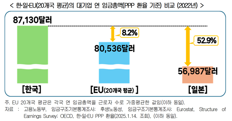 한국 대기업 임금은 2002년 2741만원에서 2022년 7061만원으로 157.6% 올랐지만, EU 대기업은 같은 기간 84.7% 상승했고 일본 대기업은 6.8% 줄었다.