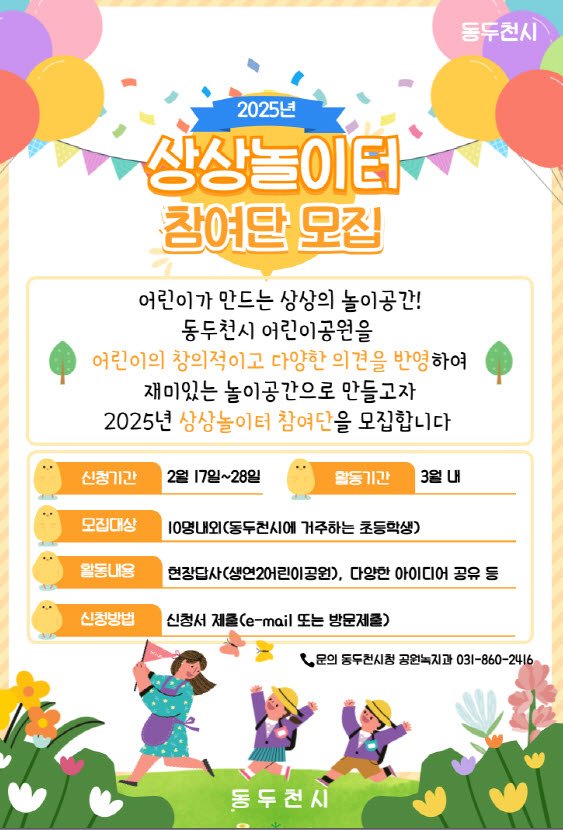 어린이참여단 모집은 2월28일까지 진행하며, 이메일 또는 동두천시청 공원녹지과에 방문하여 신청하면 된다.