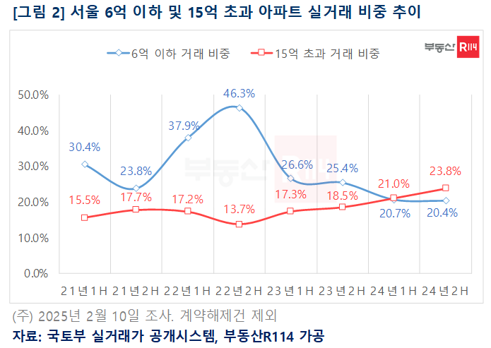 특히 서울의 경우 2022년 하반기 전체 거래의 46.3%였던 6억원 이하 아파트 매매건수가 지난해 하반기에는 20.4%까지 감소했다. 반면 같은 기간 15억원 초과 아파트는 13.7%에서 23.8%로 10%가량 비중이 확대됐다.