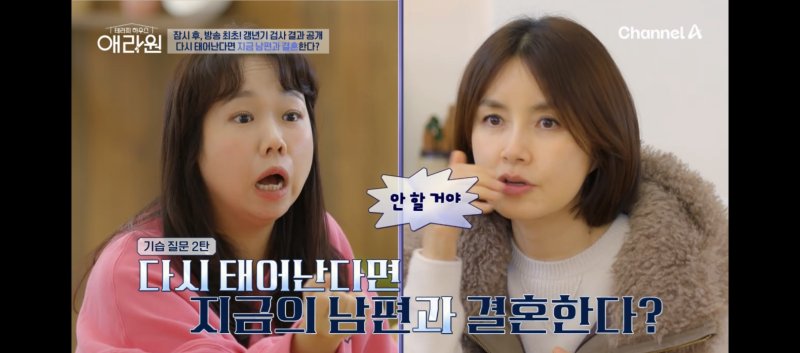 신애라는 지난 18일 방송된 채널A 예능물 '테라피 하우스 애라원'에서 코미디언 홍현희가 "다시 태어난다면 지금 남편과 결혼할 거냐"고 묻자 바로 "안 할 거야"라고 답했다.