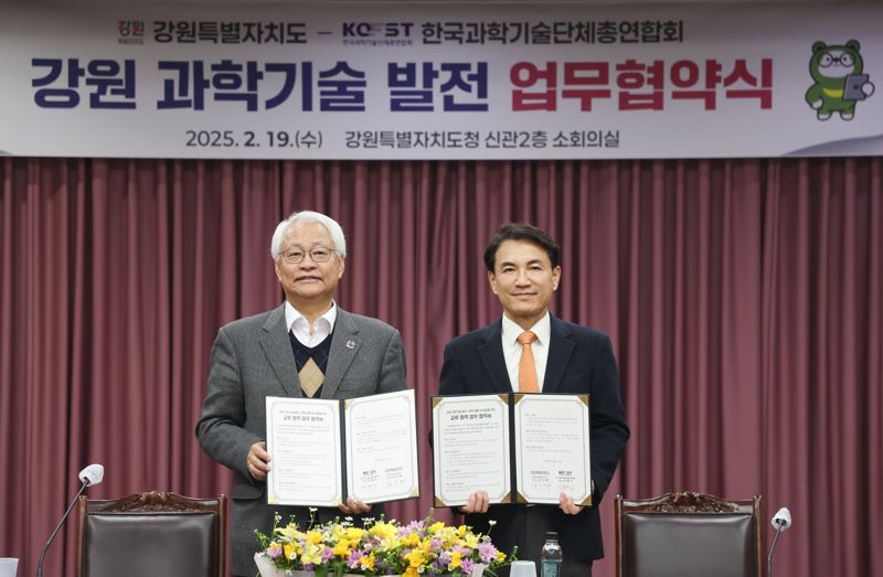 강원도와 한국과총은 19일 도청 본관 소회의실에서 김진태 강원도지사와 이태식 한국과학기술단체총연합회장 등이 참석한 가운데 강원 과학기술 발전 협력을 위한 업무협약을 체결했다.