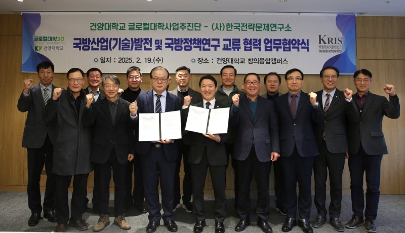(논산=연합뉴스) 정찬욱 기자 = 건양대는 글로컬대학사업추진단이 19일 논산 창의융합캠퍼스 명곡정보관에서 한국전략문제연구소와 국방산업(기술) 발전 및 국방정책연구 교류 협력 협약을 했다고 밝혔다.