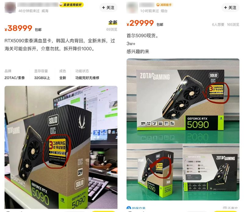 20일 업계에 따르면 지포스 RTX 50 시리즈의 최상위 모델 RTX 5090은 국내 주요 쇼핑몰에서 매진돼 구매할 수 없는 가운데 중국 온라인 중고 사이트에는 한국어로 ‘그래픽카드 3년 무상보증+2년 확대보증’이라는 스티커가 붙여진 RTX 5090가 잇따라 등장했다. 희망 거래 가격은 2만9999위안(약 594만원)에서 3만8999위안(약 773만원)에 달한다.