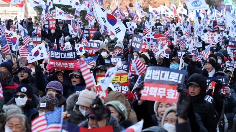 두 달 간 서울구치소와 헌재 앞 집회에 매번 참석했다는 강연장(83)씨는 "탄핵하면 안 된다. 사기 탄핵이라 나라가 망한다"며 "나라를 지키기 위해 이 곳에 왔다"고 힘주어 말했다.