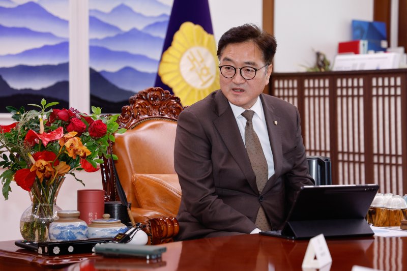 (서울=뉴스1) 안은나 기자 = 우원식 국회의장이 20일 서울 여의도 국회의장실에서 프랑스·체코 특별방문단 의원들에게 친서를 전달한 뒤 인사말을 하고 있다. 여야 의원들은 계엄 이후 한국 경제에 대한 국제사회 우려를 불식시키고 원전 계약 지원을 위해 프랑스와 체코를 국회의장 특사 자격으로 방문할 예정이다. 2025.2.20/뉴스1 /사진=뉴스1화상