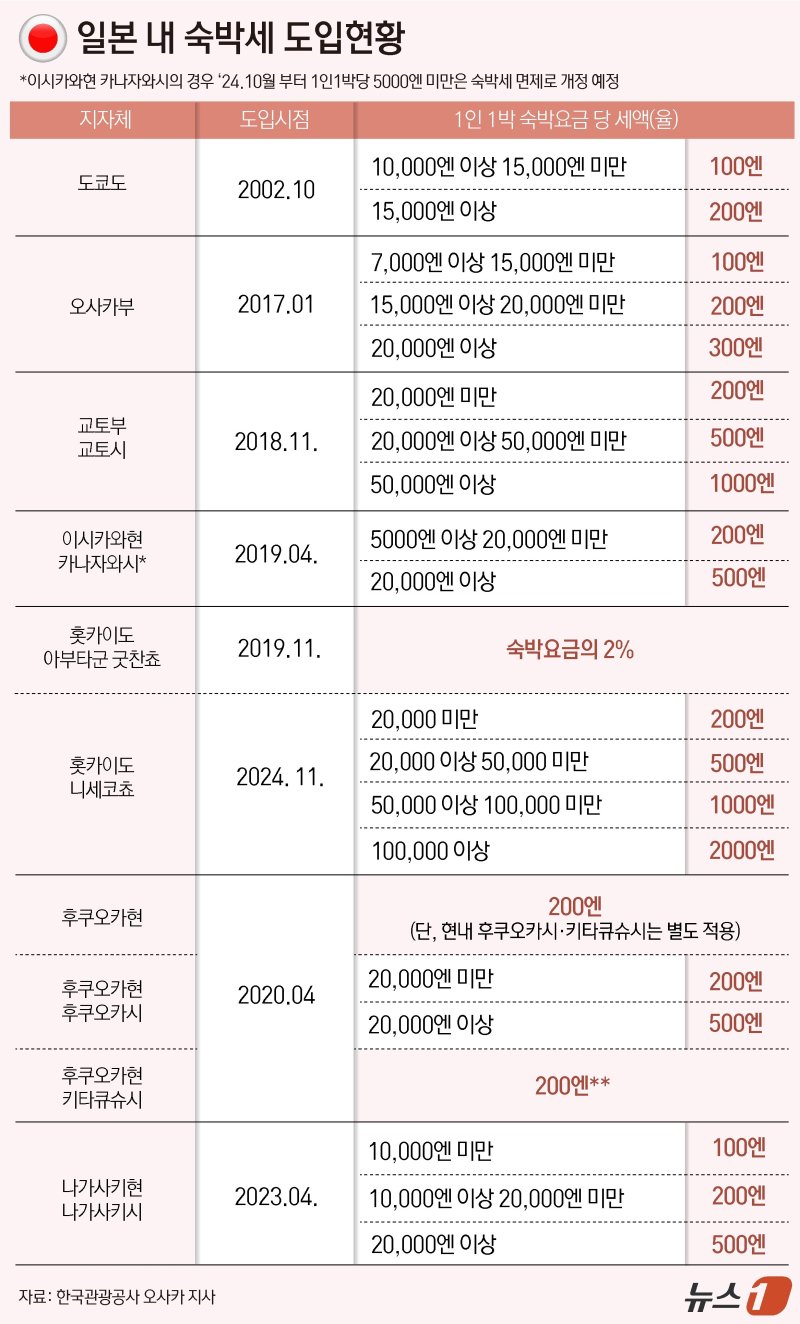 여행객이 묵는 호텔의 경우 1인 1박에 3만~4만 엔 수준일 때 500엔(약 4800원)부터 1000엔(약 9600원)까지 세금을 내야 한다.