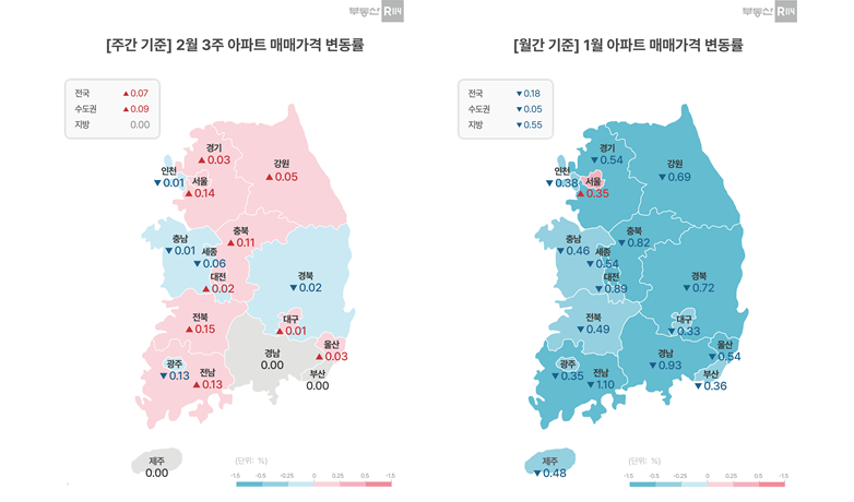 21일 부동산R114에 따르면 2월 셋째주 전국 아파트 매매가격은 전주 대비 0.07% 상승했다. 서울이 0.14%, 수도권이 0.09% 상승했다. 경기ㆍ인천 지역은 직전 주 보합(0.00%)에서 0.02% 올랐다.
