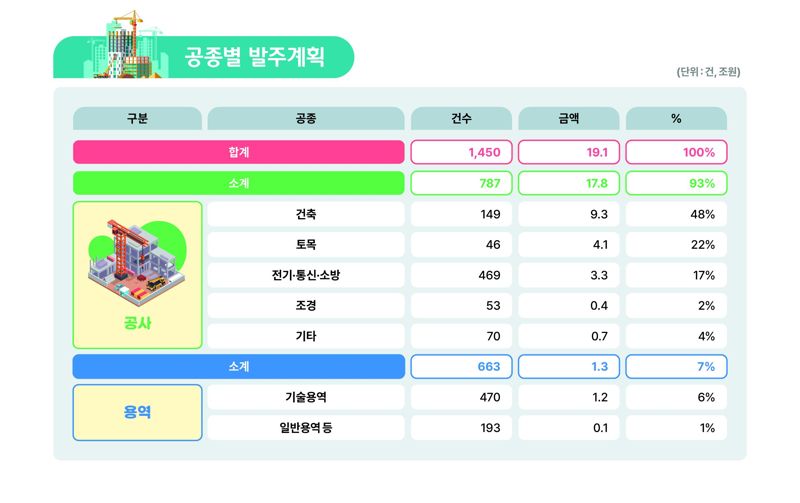 24일 LH에 따르면 올해 신규발주는 유형별로 △공사 17조8000억원(787건) △용역 1조3000억원(663건) 수준이다.