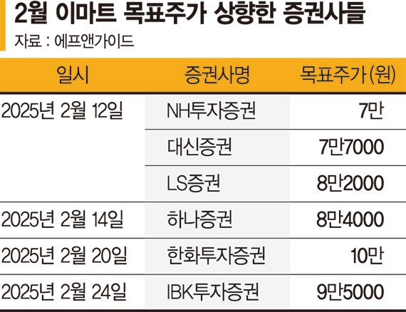 24일 금융정보업체 에프앤가이드에 따르면 한화투자증권은 이마트의 목표가를 10만원으로 올렸다. 이 외에도 IBK투자증권(9만5000원), 하나증권(8만4000원), LS증권(8만2000원), 대신증권(7만7000원), NH투자증권(7만원) 등이 이달 들어 이마트의 목표주가를 높였다.