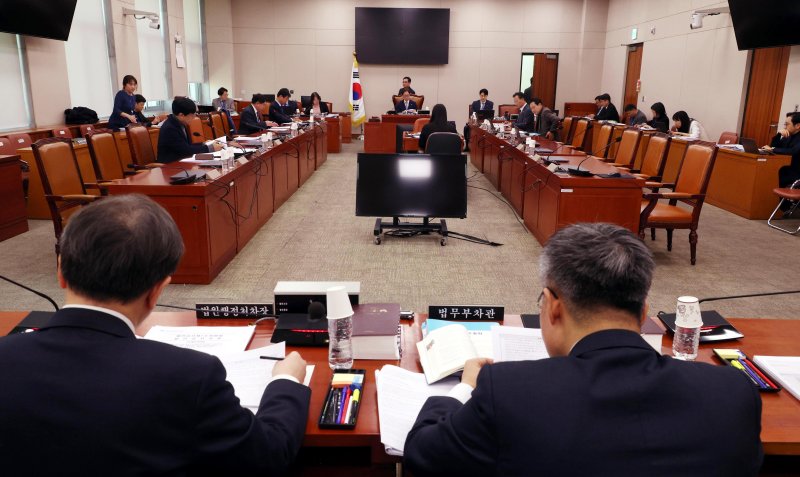 [서울=뉴시스] 신항섭 이창환 기자 = 국회 법제사법위원회는 24일 법안심사제1소위원회를 열고 야당 주도로 이른바 '명태균 특검법'을 의결했다.