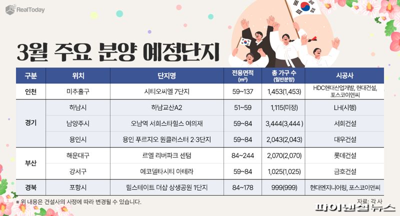 리얼투데이 관계자는 "건설사들이 봄 분양 성수기를 맞아 공급을 점차 확대하는 모습"이라면서 "대단지 및 브랜드 아파트 중심으로 물량이 늘어나면서 3월 청약 결과가 상반기 분양 시장의 흐름을 가늠하는 중요한 지표 될 것"이라고 전했다.