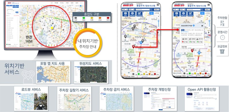 주요 내용은 대구 시내 전체 공영주차장의 위치, 주차면수, 운영시간, 요금 등 기본정보 제공, 실시간 주차 가능 정보 제공, 주차정기권, QR사전정산 등 무정차 정산(모바일 결재) 서비스다.
