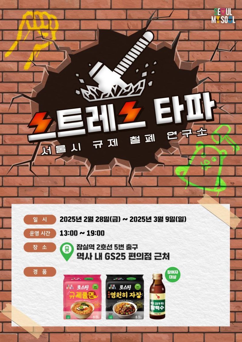 민수홍 서울시 홍보기획관은 "서울시 규제철폐연구소 팝업스토어에서 온몸으로 스트레스를 날리며 실제로 규제를 타파하는 짜릿한 경험을 통해 없애면 편해지는 것들에 대해 함께 고민해주시기를 바란다"고 말했다.