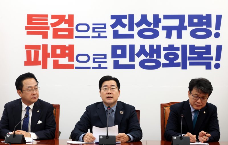 박 원내대표는 이날 오전 국회 본청에서 열린 정책조정회의에서 "민주당은 오늘 야5당과 함께 명태균 특검법을 처리한다"고 밝혔다.