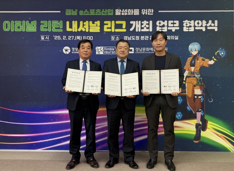 [창원=뉴시스]홍정명 기자 = 경남도는 27일 도청 중앙회의실에서 경남문화예술진흥원, 님블뉴런과 함께 경남 이스포츠산업 활성화를 위한 '이터널 리턴 내셔널 리그 경남 개최 업무협약'을 체결했다.