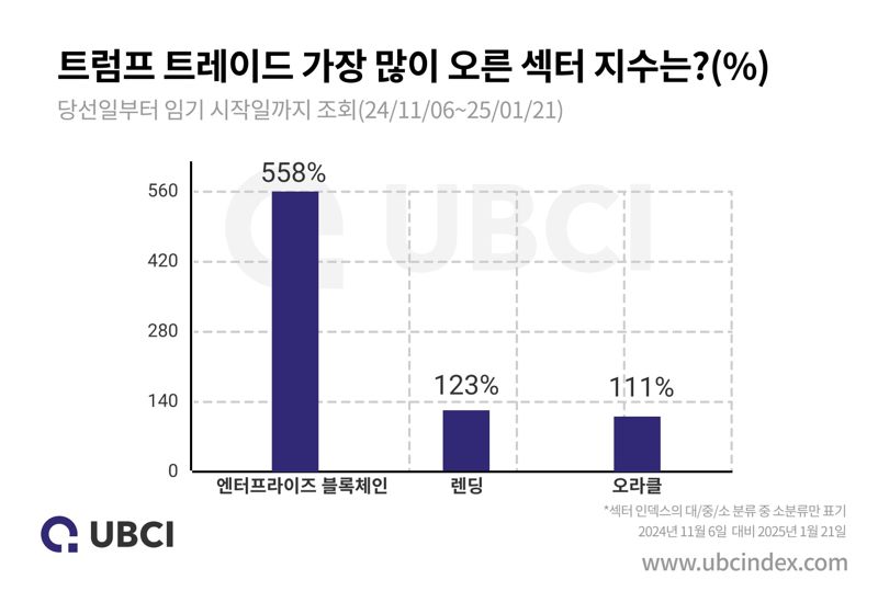 업비트 UBCI는 28일 도널드 트럼프 미국 대통령 당선부터 취임까지의 기간 동안 가상자산 지수 상승률 상위 3개 섹터를 공개했다. 36개의 섹터 중 가장 높은 상승률을 보인 것은 ‘엔터프라이즈 블록체인’ 지수로, 558.11% 상승한 것으로 나타났다.