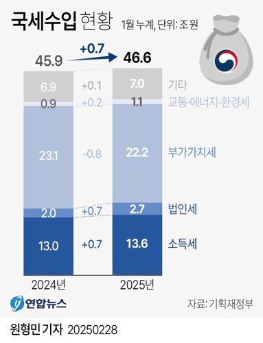 [파이낸셜뉴스] 올해 1월 국세수입이 전년동기 대비 7000억원 증가했다고 28일 기획재정부가 밝혔다. 2년 연속 '세수펑크' 이후 나온 올해 첫 월별 국세수입 현황이다. 소득세, 법인세가 각각 7000억원 증가하고 부가가치세는 8000억원 감소했다. 총국세는 46조6000억원으로 지난해 1월 대비 1.5% 늘어났다.
